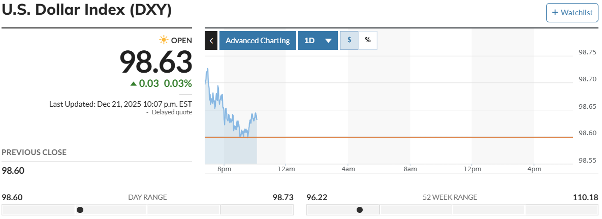 Cùng thời điểm, trên thị trường thế giới, chỉ số USD Index (DXY) - thước đo sức mạnh của đồng bạc xanh so với 6 đồng tiền chủ chốt - tăng 0,03%, hiện ở mức 98,63 điểm so với phiên liền trước.