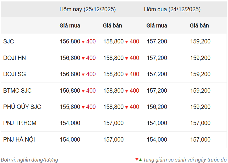 margin: 15px auto;" />Công ty Vàng bạc đá quý Sài Gòn (SJC), Tập đoàn Vàng bạc Đá quý DOJI và Bảo Tín Minh Châu cùng niêm yết giá vàng miếng SJC mua vào-bán ra ở mức 156,8-158,8 triệu đồng/lượng, giảm 400.000 đồng ở cả chiều mua và chiều bán ra so với chốt phiên trước.