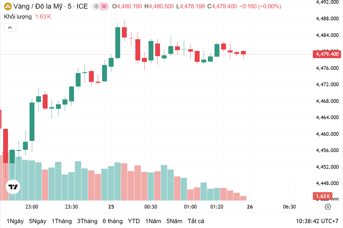 Thời điểm 10h00' theo giờ Việt Nam, giá vàng thế giới giao ngay ở mức 4.479 USD/ounce, tăng 2 USD/ounce so với với đầu phiên sáng. Hiện, giá vàng thế giới quy đổi theo tỷ giá niêm yết tại Vietcombank vào khoảng 142,5 triệu đồng/lượng.