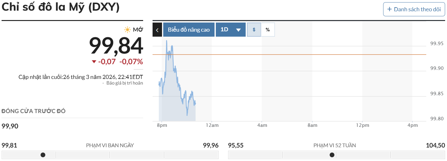 Cùng thời điểm, trên thị trường thế giới, chỉ số USD Index (DXY) - thước đo sức mạnh của đồng bạc xanh so với 6 đồng tiền chủ chốt - ở mức 99,84 điểm, giảm 0,07 điểm so với phiên giao dịch trước.