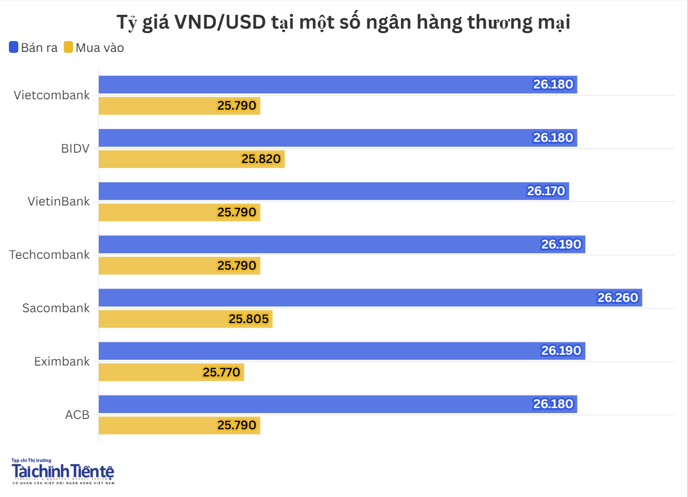 Hiện, giá mua thấp nhất ở mức 25.770 VND/USD, giá mua cao nhất ở mức 25.820 VND/USD. Giá bán ra thấp nhất ở mức 26.170 VND/USD, giá bán cao nhất ở mức 26.260 VND/USD