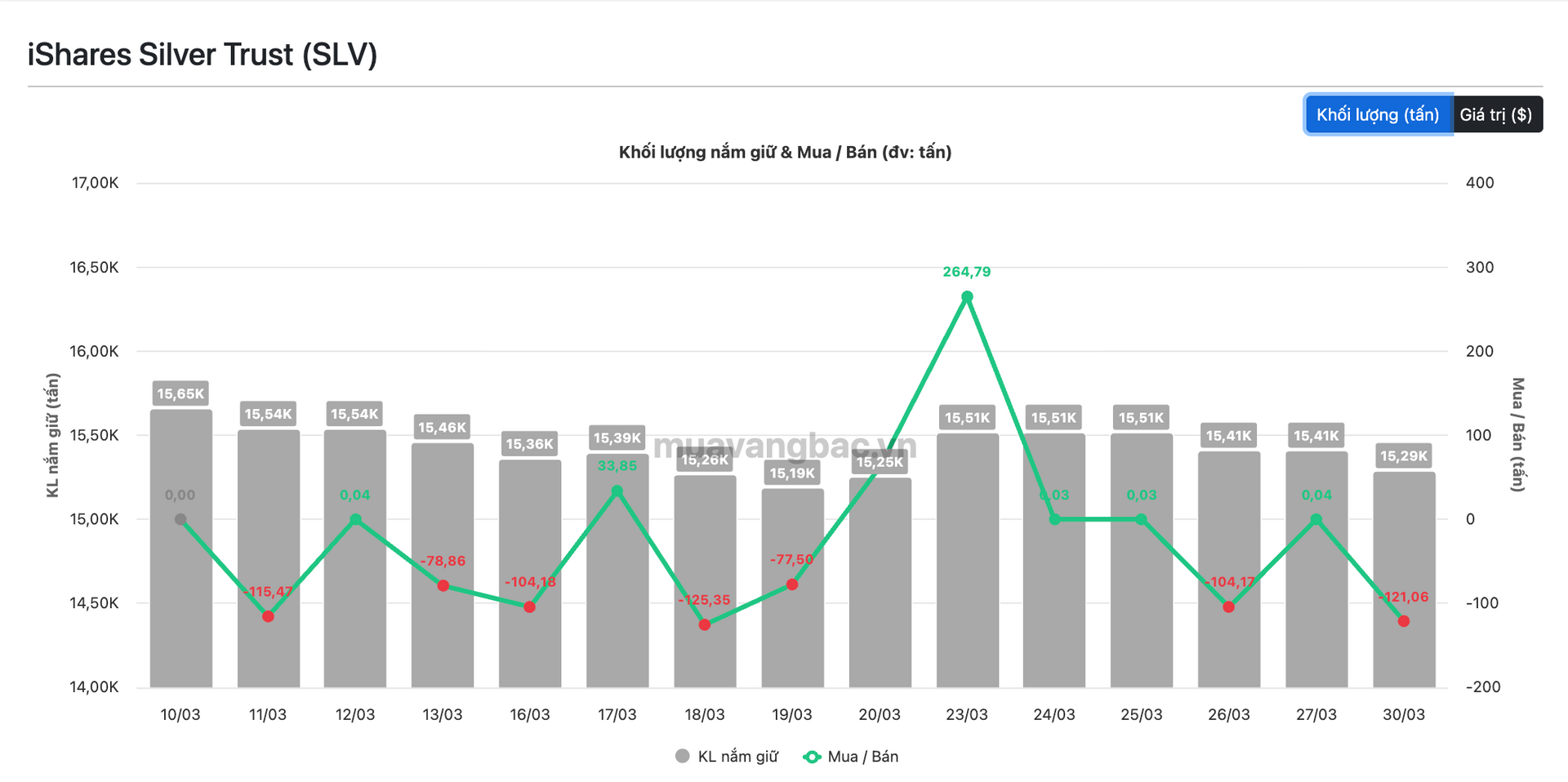 Theo dữ liệu từ muavangbac.vn, trong phiên giao dịch ngày 30/3, quỹ bạc lớn nhất thế giới iShares Silver Trust (SLV) do BlackRock quản lý đã bán ròng hơn 121 tấn bạc. Tính trong 5 phiên gần nhất, quỹ này đã bán ra hơn 225 tấn. Hiện tại, SLV còn nắm giữ khoảng 15.290 tấn bạc, tương đương gần 35 tỷ USD.