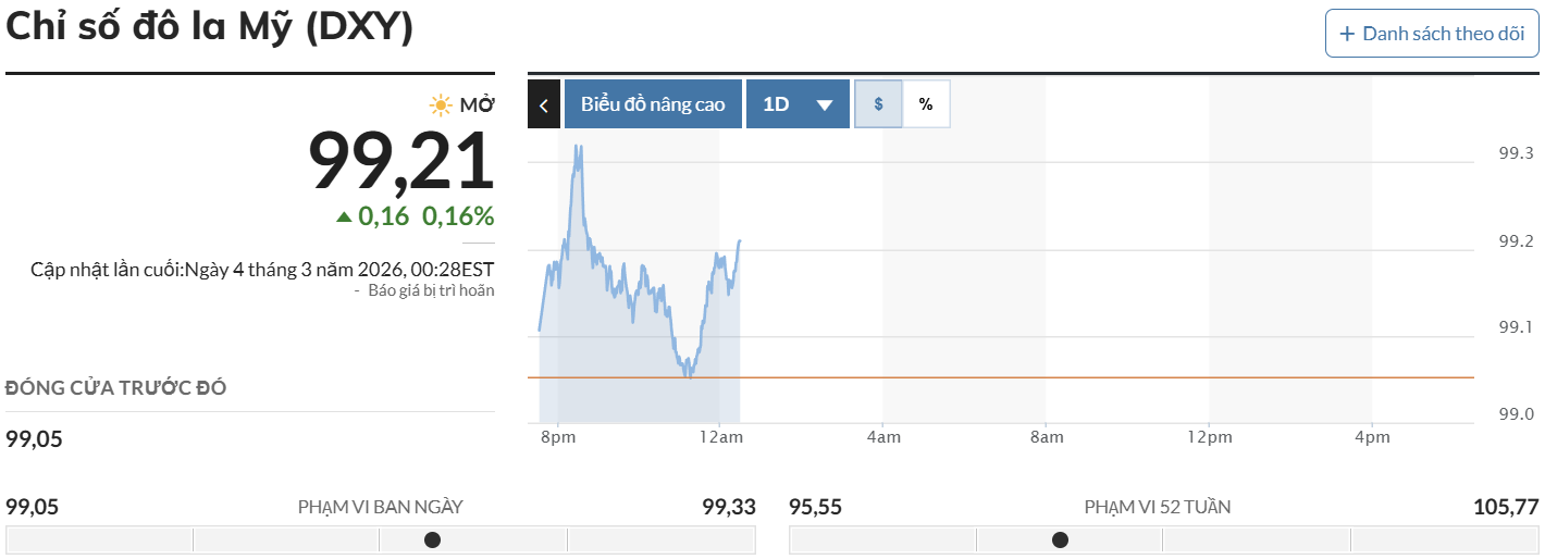 Chỉ số DXY duy trì trên mức 99 điểm sau 2 ngày tăng mạnh, do lo ngại rằng một cuộc xung đột kéo dài ở Trung Đông có thể duy trì đà tăng giá năng lượng, làm dấy lên lo ngại về lạm phát.