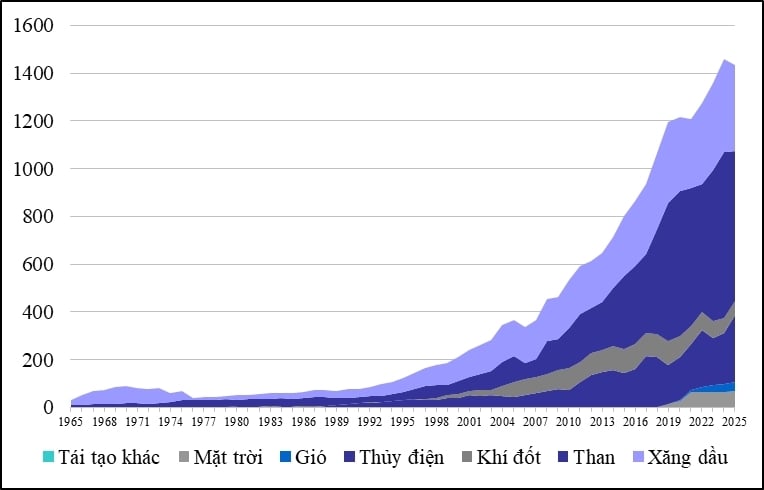 Tuy nhiên, phân tích sâu hơn cho thấy nền kinh tế Việt Nam vẫn phụ thuộc đáng kể vào nhiên liệu hóa thạch. Than đá tiếp tục giữ vai trò trụ cột trong sản xuất điện, với sản lượng tiêu thụ tăng mạnh từ khoảng 169 TWh năm 2010 lên hơn 626 TWh vào năm 2025. Xăng dầu vẫn chi phối lĩnh vực vận tải và logistics, với mức tiêu thụ duy trì trên 300 TWh trong nhiều năm gần đây. Khí đốt tự nhiên, dù chiếm tỉ trọng nhỏ hơn, vẫn đóng vai trò quan trọng trong hệ thống điện khí. Trong khi đó, thủy điện tiếp tục là nguồn năng lượng nội địa ổn định nhất. Sản lượng thủy điện tăng từ khoảng 74 TWh năm 2010 lên hơn 281 TWh vào năm 2025. Tuy nhiên, tiềm năng mở rộng của thủy điện gần như đã đạt tới giới hạn do các ràng buộc về địa hình và môi trường, khiến chiến lược phát triển năng lượng trong tương lai phải dựa nhiều hơn vào điện gió và điện mặt trời.