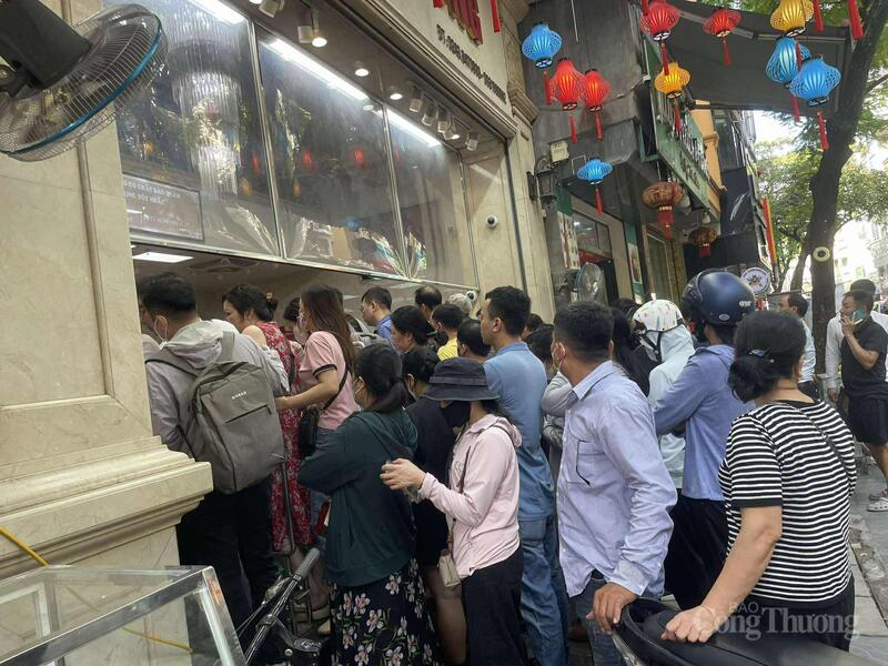 Ngay từ sáng sớm, rất đông người dân xếp hàng chờ mua bánh trung thu tại phố Thụy Khuê.