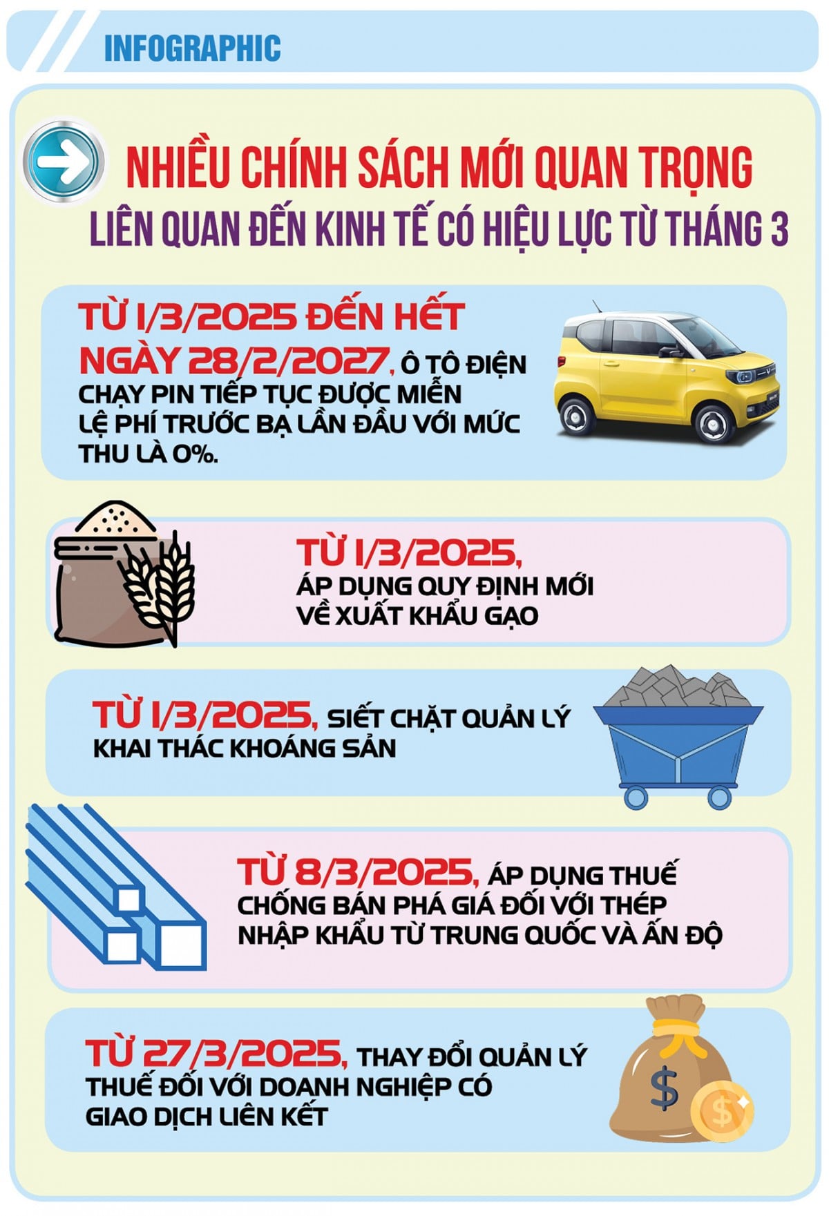 Từ tháng 3/2025, nhiều chính sách về lĩnh vực kinh tế sẽ chính thức có hiệu lực, trong đó quy định về mức thu lệ phí trước bạ ô tô điện, xuất khẩu gạo, quản lý thuế doanh nghiệp, thuế chống bán phá giá thép nhập khẩu.