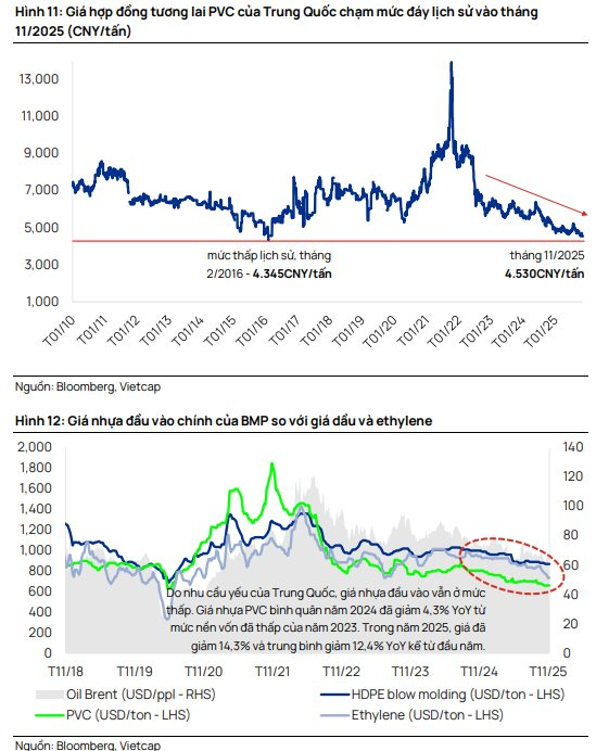 Theo Vietcap, biên lợi nhuận gộp của BMP nhiều khả năng sẽ cải thiện đáng kể trong quý cuối năm. Giá PVC – nguyên liệu chiếm tỷ trọng lớn trong cấu thành chi phí đã giảm thêm 6–7% so với quý 3 và đang ở vùng thấp nhất kể từ khi thị trường Trung Quốc bắt đầu chu kỳ suy yếu. Tính từ đầu năm, mức giảm đã lên tới hơn 14%, trong khi hợp đồng tương lai PVC của Trung Quốc thậm chí tiệm cận đáy lịch sử trong tháng 11.