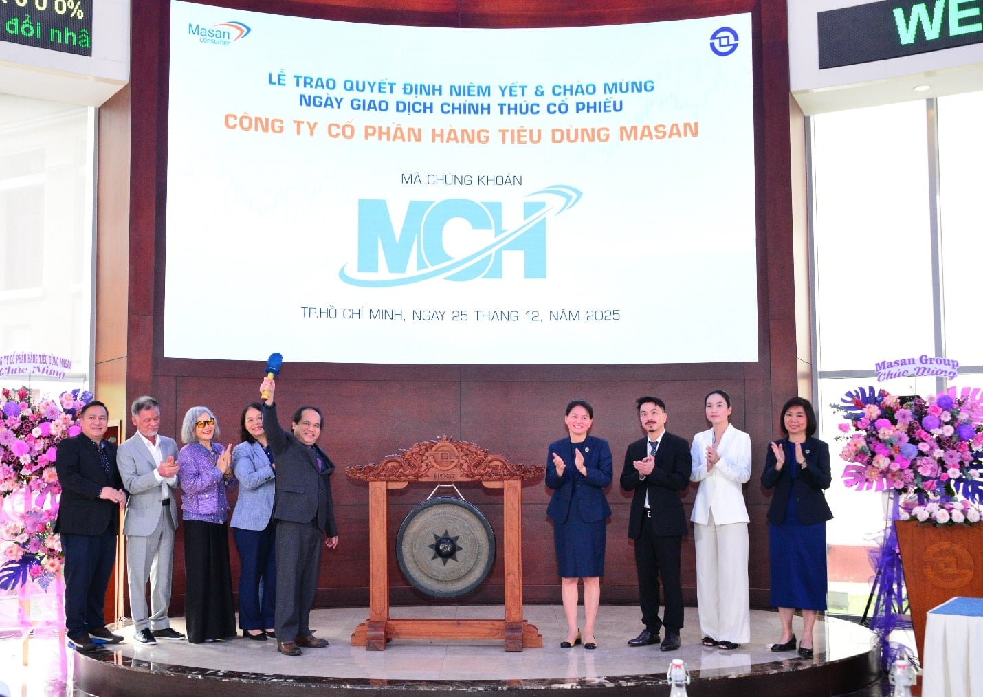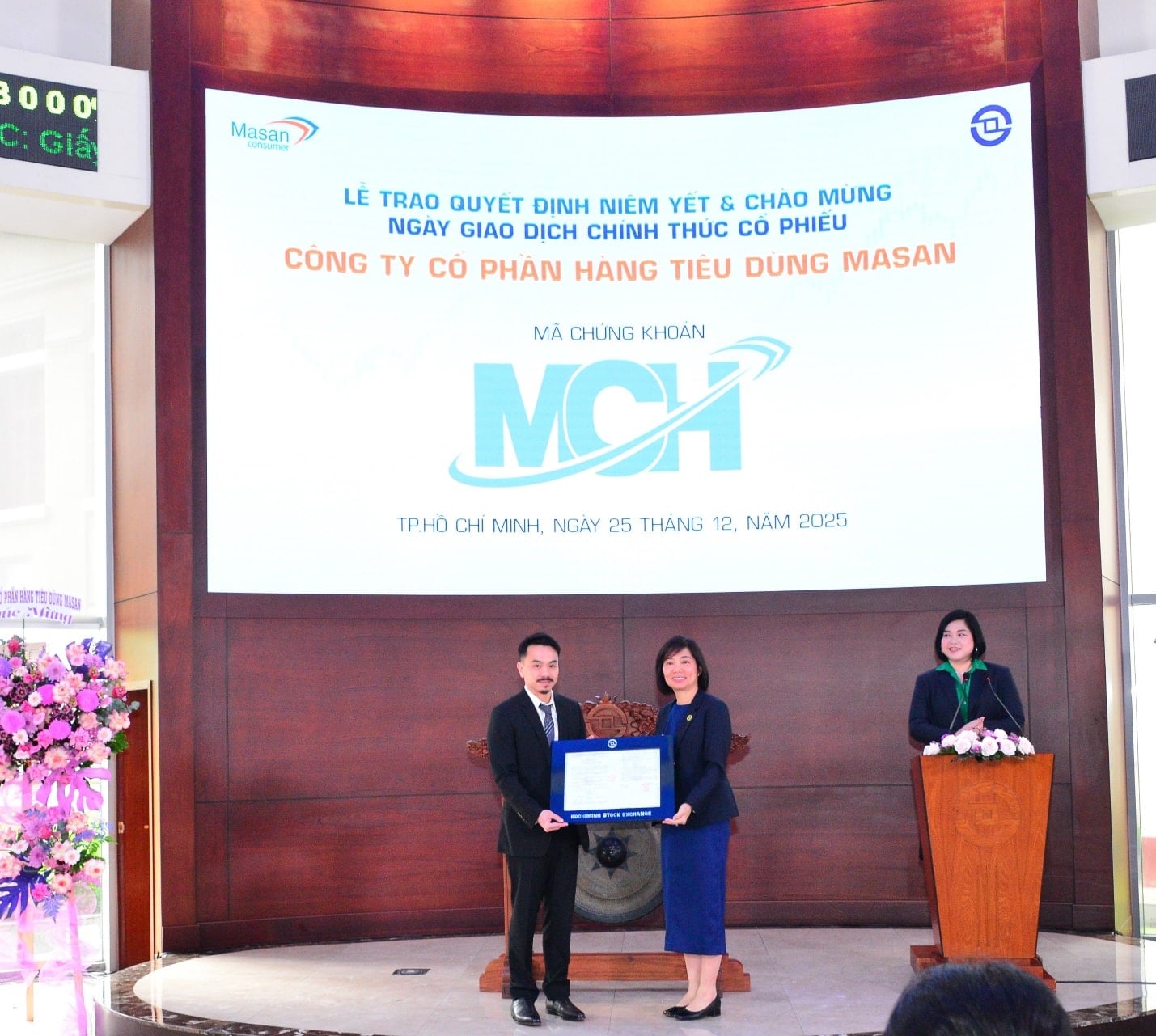 (Banker.vn) Ngày 25/12/2025, Sở Giao dịch Chứng khoán TP.Hồ Chí Minh đã tổ chức Lễ trao quyết định niêm yết cho Công ty Cổ phần Hàng tiêu dùng Masan (Mã chứng khoán: MCH) và đưa vào giao dịch chính thức 1.067.620.746 cổ phiếu MCH với tổng giá trị niêm yết (theo mệnh giá) là hơn 10.676 tỷ đồng.