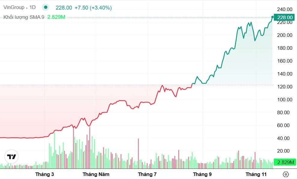 Phiên giao dịch ngày 20/11 ghi nhận cổ phiếu VIC tiếp tục duy trì đà hưng phấn, tăng hơn 3% lên 227.800 đồng/cp. Đà tăng này đưa vốn hóa của Vingroup tiến gần mốc 900.000 tỷ đồng, tương đương khoảng 34 tỷ USD, tiếp tục giữ vững vị trí doanh nghiệp giá trị lớn nhất thị trường chứng khoán Việt Nam.