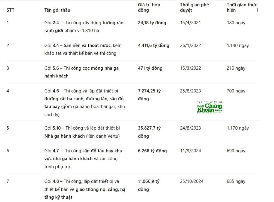 Tính đến nay, khi giai đoạn 1 dự án bước vào chặng nước rút, Vinaconex tổng cộng đã tham gia trực tiếp vào 7 gói thầu tại sân bay Long Thành, với tổng giá trị hợp đồng khoảng 65.343,6 tỷ đồng. Từ những hạng mục khởi đầu giản đơn đến các công trình then chốt nhất, dấu ấn của Vinaconex trải khắp dự án, khẳng định vị thế của một trong những nhà thầu xây lắp hàng đầu.