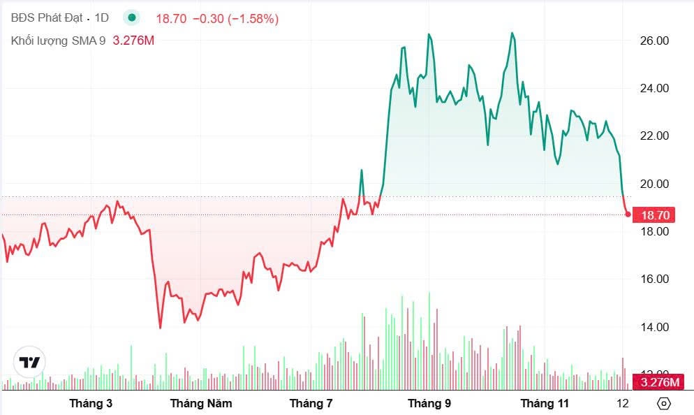Trong bối cảnh thị trường chứng khoán diễn biến kém tích cực và xu hướng chung nghiêng về phía điều chỉnh, cổ phiếu PDR của Công ty CP Phát triển Bất động sản Phát Đạt cũng đang trải qua những ngày giảm sâu. Tính đến phiên sáng 16/12, thị giá PDR lùi về mức 18.800 đồng/cổ phiếu, giảm mạnh so với vùng đỉnh của năm tại 27.000 đồng.