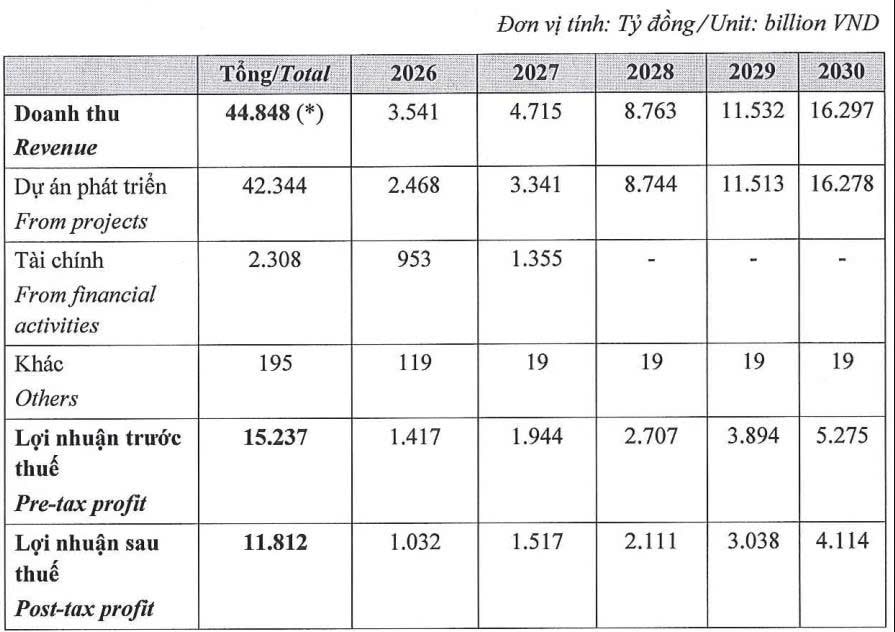 Phát Đạt ước tính tổng doanh thu từ các dự án này đạt 35.525 tỷ đồng, chưa bao gồm doanh thu tài chính từ dự án khu nhà ở phức hợp cao tầng Thuận An 1. Trên cơ sở đó, HĐQT thông qua kế hoạch kinh doanh giai đoạn 2026 – 2030 với tổng doanh thu 44.848 tỷ đồng và lợi nhuận sau thuế 11.812 tỷ đồng. Riêng năm 2026, doanh thu và lợi nhuận sau thuế dự kiến lần lượt đạt 3.541 tỷ đồng và 1.032 tỷ đồng.