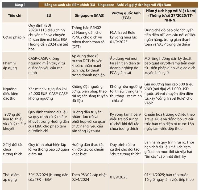 Bức tranh triển khai Travel Rule giai đoạn 2023 - 2025 cho thấy EU đặt tiêu chuẩn dữ liệu và quy trình xử lý rất chi tiết ở cấp quy định và hướng dẫn kỹ thuật, Singapore tập trung nhiều vào năng lực thực thi ngay bên trong doanh nghiệp thông qua một hệ thống hướng dẫn thao tác dễ áp dụng, còn Anh giải quyết thẳng vào rủi ro chênh lệch chuẩn giữa các khu vực pháp lý bằng bộ kỳ vọng xử lý giao dịch với đối tác chưa tương thích; khi ghép ba mảnh này lại và đặt bên cạnh cơ chế báo cáo dữ liệu điện tử trong Thông tư số 27/2025/TT-NHNN, Việt Nam có thể thiết kế ngay một lộ trình đồng bộ dữ liệu và quy trình cho giai đoạn thí điểm, trong đó có việc xây dựng cổng Travel Rule kết nối FIU với các VASP được cấp phép, ban hành bộ trường dữ liệu tối thiểu tương thích và văn bản hóa quy trình rủi ro khi tiếp nhận giao dịch từ đối tác nước ngoài chưa đủ chuẩn, qua đó giảm thiểu điểm mù ở các mắt xích on/off-ramp và tăng cường khả năng truy vết khi cần thiết (European Parliament & Council, 2023; EBA, 2024; MAS, 2024, 2025; FCA, 2023).
