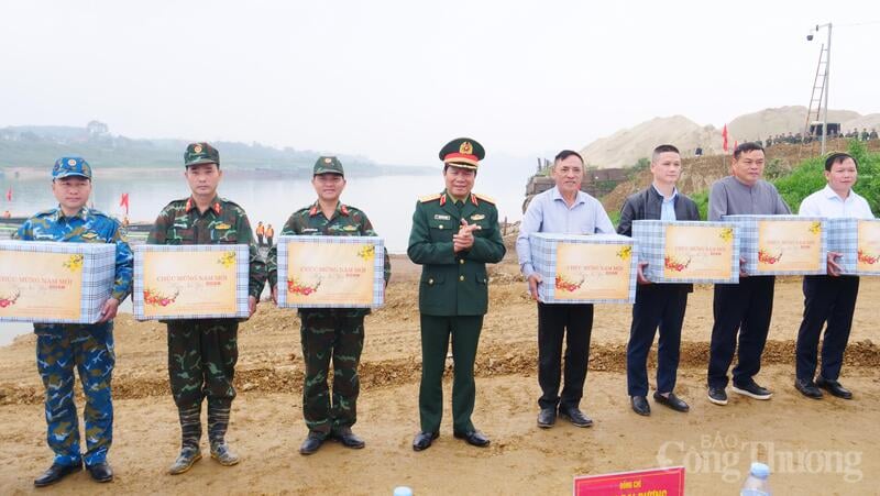 Đại tướng Nguyễn Tân Cương, Thứ trưởng Bộ Quốc phòng trao quà của Bộ Quốc phòng cho các đơn vị tham gia thi công.