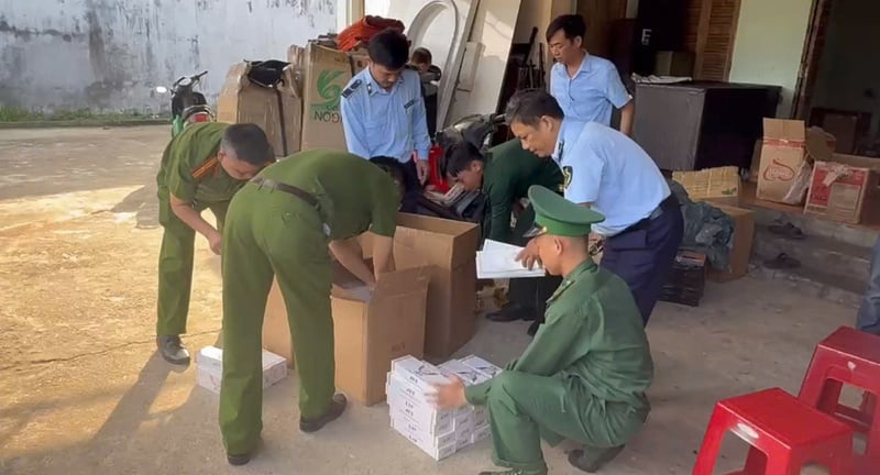 margin: 15px auto;" />Lực lượng chức năng tiến hành thu giữ, lập biên bản xử lý 1.400 bao thuốc lá không rõ nguồn gốc. Ảnh: ĐVCC