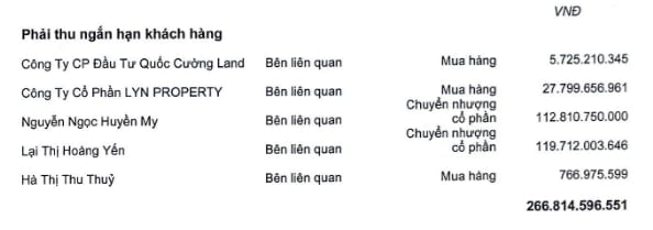 Cụ thể, báo cáo ghi nhận khoản phải thu ngắn hạn gần 113 tỷ đồng đối với bà Nguyễn Ngọc Huyền My (em gái Tổng Giám đốc Nguyễn Quốc Cường) và gần 120 tỷ đồng đối với bà Lại Thị Hoàng Yến (con gái Chủ tịch Hội đồng quản trị Lại Thế Hà). Các khoản phải thu này được hạch toán dưới nội dung chuyển nhượng cổ phần.