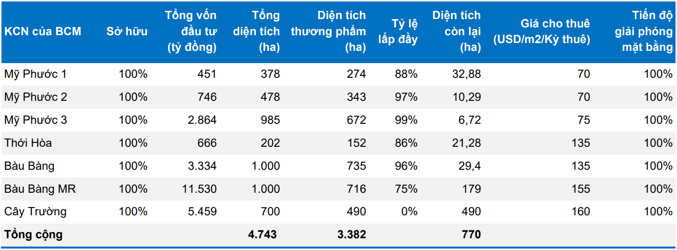 Trong bối cảnh quỹ đất công nghiệp tại Bình Dương ngày càng hạn chế, các dự án mới được xem là yếu tố quan trọng giúp duy trì dư địa tăng trưởng cho doanh nghiệp. Một trong những dự án đáng chú ý là khu công nghiệp Cây Trường với quy mô khoảng 700 ha, trong đó diện tích đất thương phẩm có thể khai thác vào khoảng 490 ha. Dự án này đã được phê duyệt quy hoạch chi tiết và được kỳ vọng sẽ bắt đầu ghi nhận doanh thu từ năm 2026, với mức giá cho thuê ước tính khoảng 160 USD/m² cho toàn kỳ thuê.