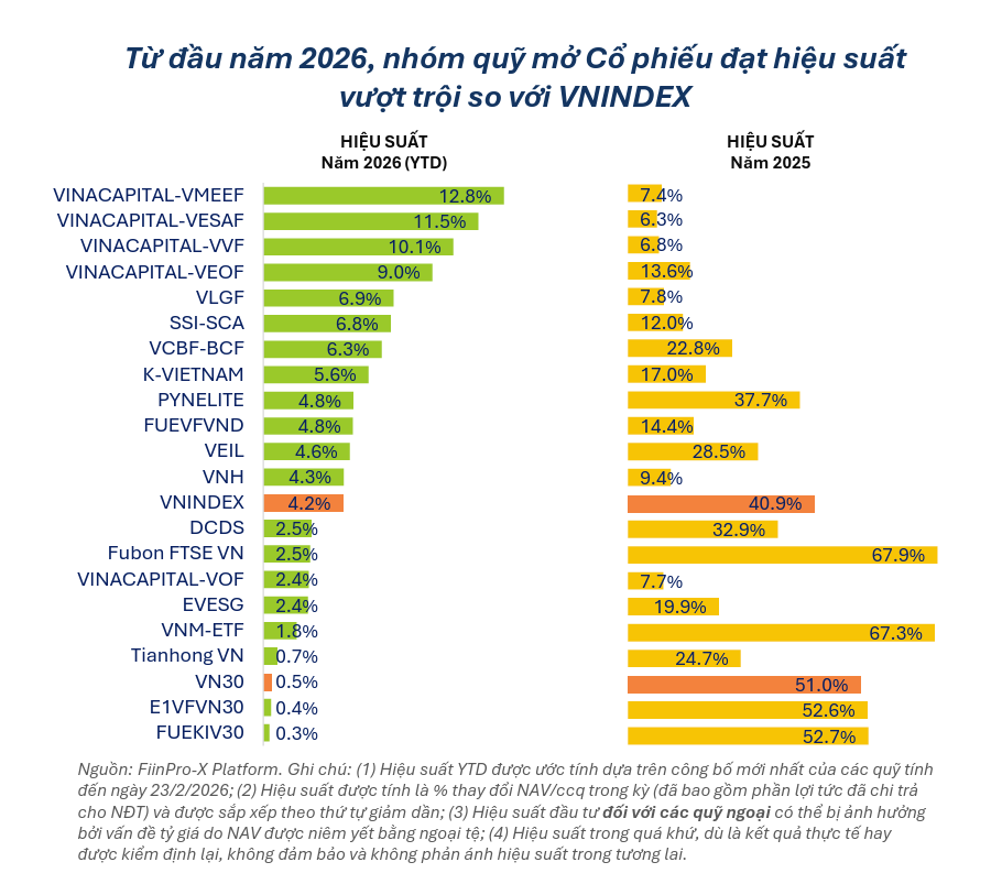 Tính từ đầu năm 2026, nhóm quỹ mở cổ phiếu đạt mức sinh lời 12,8%, vượt trội so với VN-Index, cho thấy khả năng lựa chọn cổ phiếu và điều chỉnh danh mục đang mang lại hiệu quả tích cực trong bối cảnh thị trường biến động.