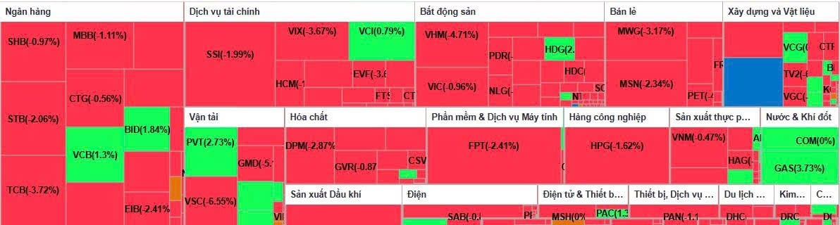 Áp lực giảm điểm tập trung chủ yếu ở nhóm cổ phiếu vốn hóa lớn. Trong rổ VN30, chỉ còn lại bốn mã giữ được sắc xanh gồm PLX, GAS, BID và VCB, trong khi VIB đứng giá. Những cổ phiếu này đóng vai trò như lực đỡ hiếm hoi, giúp kìm hãm phần nào đà giảm của chỉ số chung.