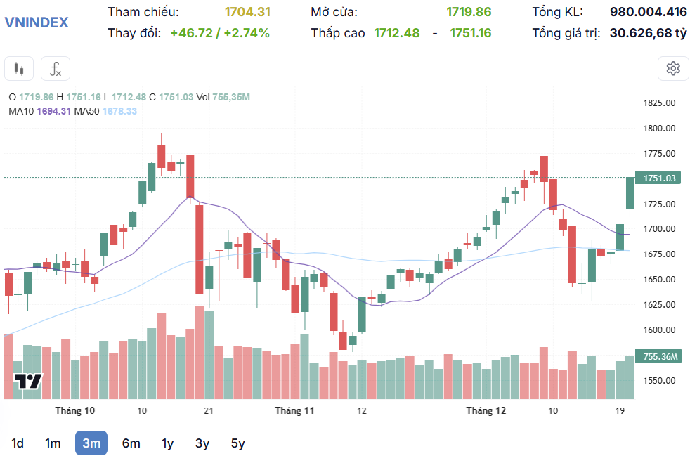Kết thúc phiên giao dịch, sàn HOSE có 216 mã tăng (7 mã tăng trần) và 97 mã giảm, VN-Index tăng 46,72 điểm (+2,74%), lên 1.751,03 điểm. Tổng khối lượng giao dịch đạt hơn 776,7 triệu đơn vị, giá trị đạt 24.140,3 tỷ đồng, cùng tăng hơn 26% cả về khối lượng và giá trị so với phiên cuối tuần trước ngày 19/12. Giao dịch thỏa thuận đóng góp hơn 224,6 triệu đơn vị, giá trị đạt 9.529,5 tỷ đồng.