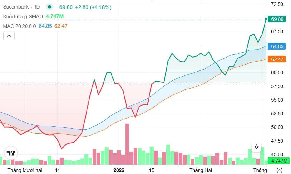 Động lực tăng giá gần đây của STB gắn với nhiều thông tin đáng chú ý. Một trong những yếu tố thu hút sự quan tâm là việc Sacombank nộp đơn đăng ký nhãn hiệu “Ngân hàng Sài Gòn Tài Lộc Việt Nam” vào cuối tháng 12/2025. Thông tin này làm dấy lên đồn đoán về khả năng thay đổi nhận diện thương hiệu, trong bối cảnh ngân hàng có biến động ở cấp điều hành khi ông Nguyễn Đức Thụy đảm nhận vai trò Quyền Tổng Giám đốc.