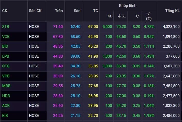margin: 15px auto;" />Nếu so sánh tương quan thị giá trong nhóm ngân hàng, STB đang dẫn đầu. Xếp ngay sau là VCB với mức giá quanh 63.500 đồng/cp và BID ở khoảng 45.700 đồng/cp. Nhóm phía dưới gồm LPB giao dịch quanh 42.500 đồng/cp, CTG ở mức 36.900 đồng/cp và VPB khoảng 28.350 đồng/cp. Các mã như MBB, HDB, ACB và EIB hiện dao động trong vùng 23.000 – 27.700 đồng/cp.