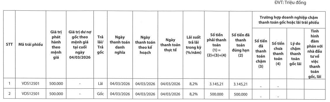Lô trái phiếu VDS12501 được phát hành vào tháng 3/2025 với 5.000 trái phiếu, mệnh giá 100 triệu đồng/trái phiếu, tổng giá trị phát hành 500 tỷ đồng. Trái phiếu có kỳ hạn 1 năm và đáo hạn vào ngày 4/3/2026.