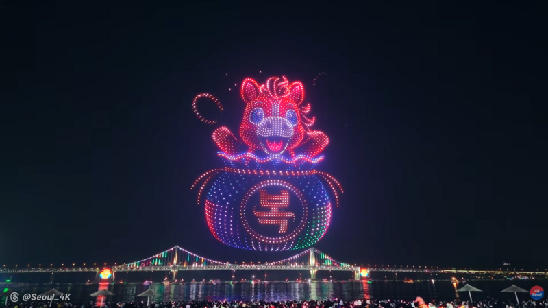 Vào dịp tết Nguyên đán 2026, với 2.500 thiết bị bay không người lái đã thắp sáng bầu trời phía trên bãi biển Gwangalli (Busan) bằng một màn trình diễn rực rỡ mang tên "Năm mới Phúc lành''. Ảnh: Seoul_4K