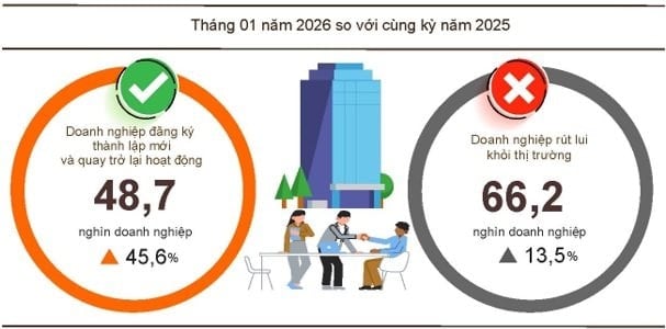 Bên cạnh đó, cả nước còn có hơn 24,5 nghìn doanh nghiệp quay trở lại hoạt động (tăng 146,2% so với tháng trước và tăng 7,6% so với cùng kỳ năm 2025), nâng tổng số doanh nghiệp thành lập mới và quay trở lại hoạt động trong tháng 1/2026 lên gần 48,7 nghìn doanh nghiệp, tăng 45,6% so với cùng kỳ năm 2025.