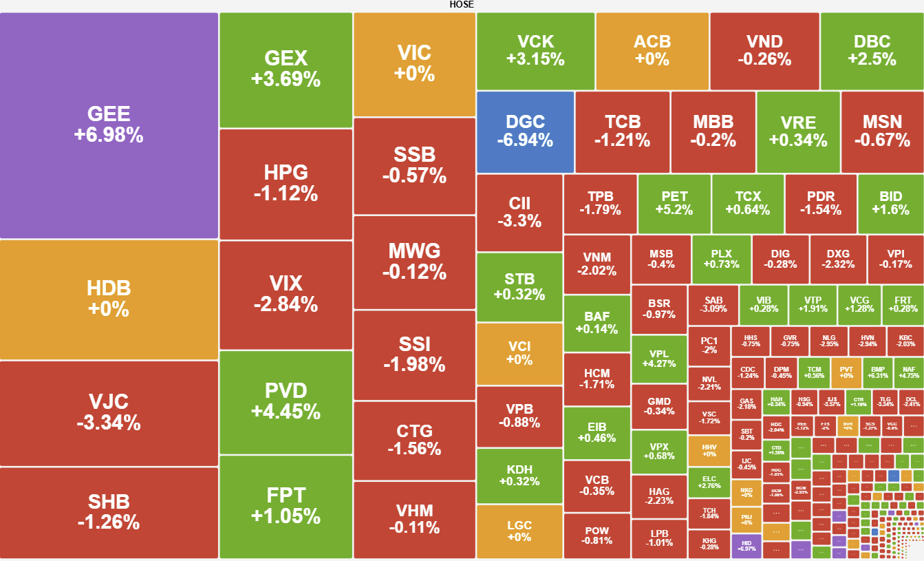 Điểm đáng chú ý nhất là thanh khoản sụt giảm gần 50% so với phiên trước, phản ánh tâm lý thận trọng cực độ của nhà đầu tư sau nhịp hồi phục mạnh từ vùng 1.630 điểm. Dòng tiền nhỏ lẻ tìm cơ hội ở các mã dầu khí và tiêu dùng như PET tăng 5%, PVD tăng 4%, PLX tăng 3%.