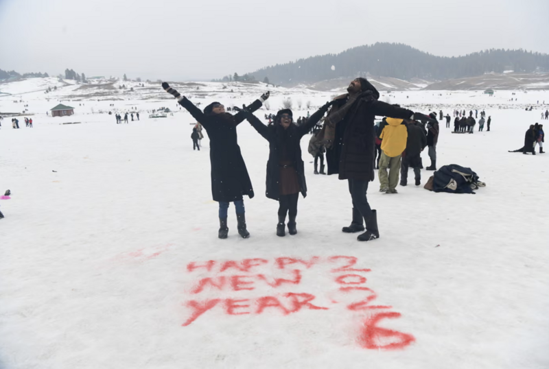 Tại Nam Á, không khí lễ hội cũng sớm hiện diện tại nhiều điểm du lịch của Ấn Độ, trong đó có khu nghỉ dưỡng Gulmarg ở vùng Jammu và Kashmir do Ấn Độ quản lý, nơi du khách đón năm mới giữa khung cảnh tuyết phủ trắng xóa.
