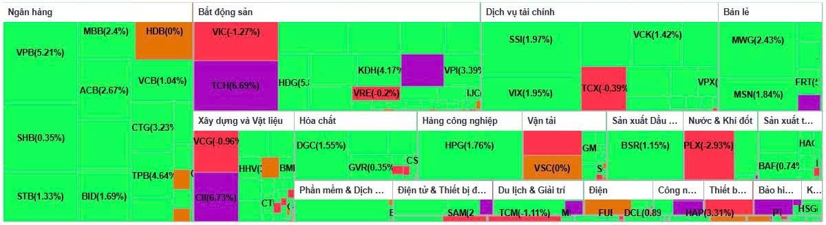 margin: 15px auto;" />Nhóm VN30 tiếp tục đóng vai trò dẫn dắt, trong đó các cổ phiếu ngân hàng là lực kéo nổi bật nhất. VPB duy trì vị trí dẫn đầu khi tăng 5,2% lên 25.250 đồng/cổ phiếu. Cùng với đó, TPB tăng 4,6% lên 15.800 đồng/cổ phiếu. Nhiều mã ngân hàng khác như MBB, VIB, ACB, CTG và TCB cũng đồng loạt tăng từ 2% đến 3%, góp phần nâng đỡ chỉ số chung.