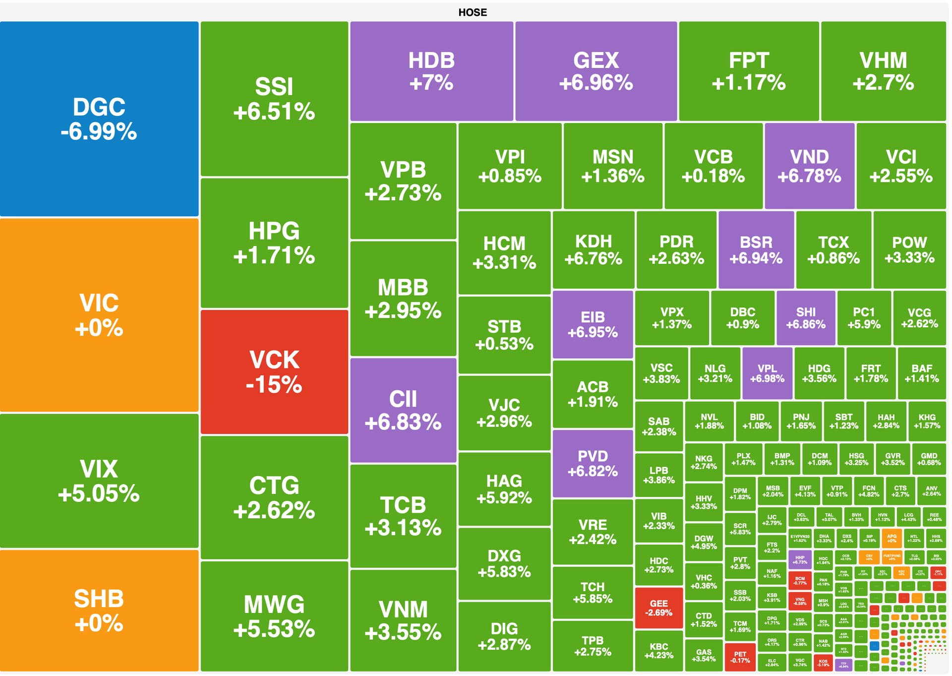 Kết thúc phiên giao dịch hôm nay, sàn HOSE có 253 mã tăng (12 mã tăng trần) và 66 mã giảm, VN-Index tăng 33,17 điểm (+2,02%), lên 1.679,18 điểm. Tổng khối lượng giao dịch đạt hơn 832 triệu đơn vị, giá trị đạt 24.450,7 tỷ đồng, tăng hơn 21% về khối lượng và 30% về giá trị so với phiên hôm qua. Giao dịch thỏa thuận đóng góp hơn 82,1 triệu đơn vị, giá trị đạt 2.771 tỷ đồng.