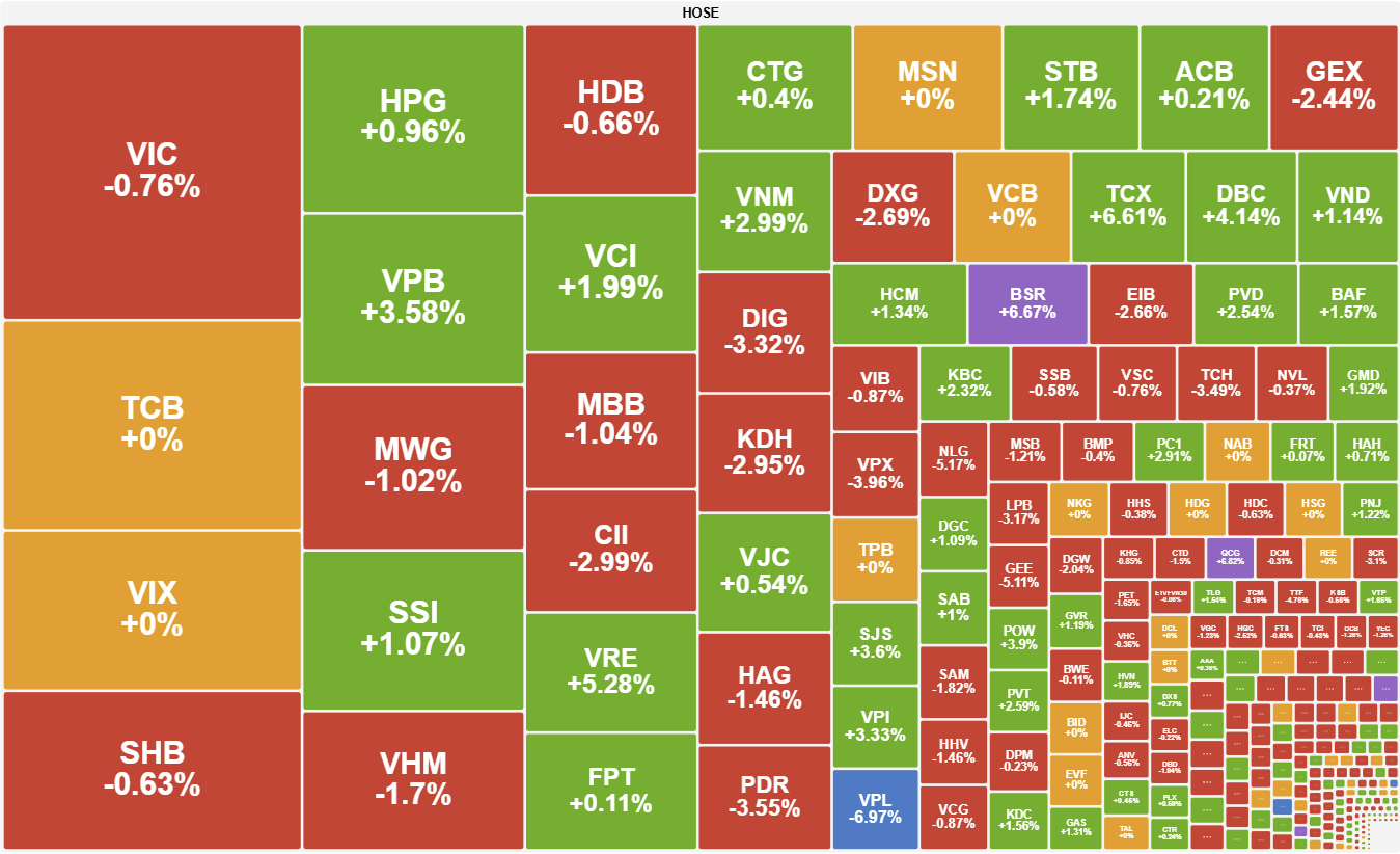 Bước sang phiên chiều, sắc đỏ quay trở lại khi nhóm Vingroup là nguyên nhân chính đẩy chỉ số xuống dưới tham chiếu. Tuy nhiên, trong 15 phút cuối phiên và ATC, lực cầu mạnh mẽ đã xuất hiện, tập trung vào nhóm ngân hàng (VPB tăng 3,58%) và chứng khoán (SSI tăng 1,07%), cùng với các trụ lớn như VNM (tăng 2,99%) và GAS (tăng 1,31%).