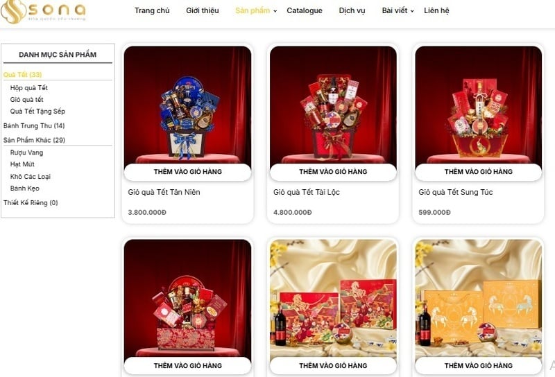 Tại sàn thương mại điện tử Sona, các giỏ quà cao cấp gồm rượu ngoại, bánh Mery Hoa Xanh, café hòa tan, kẹo trái cây, nho… có giá từ 1,6 triệu đồng đến 4,8 triệu đồng. Các mặt hàng tầm trung từ 450.000 đồng đến hơn 1 triệu đồng khá đa dạng và phong phú.