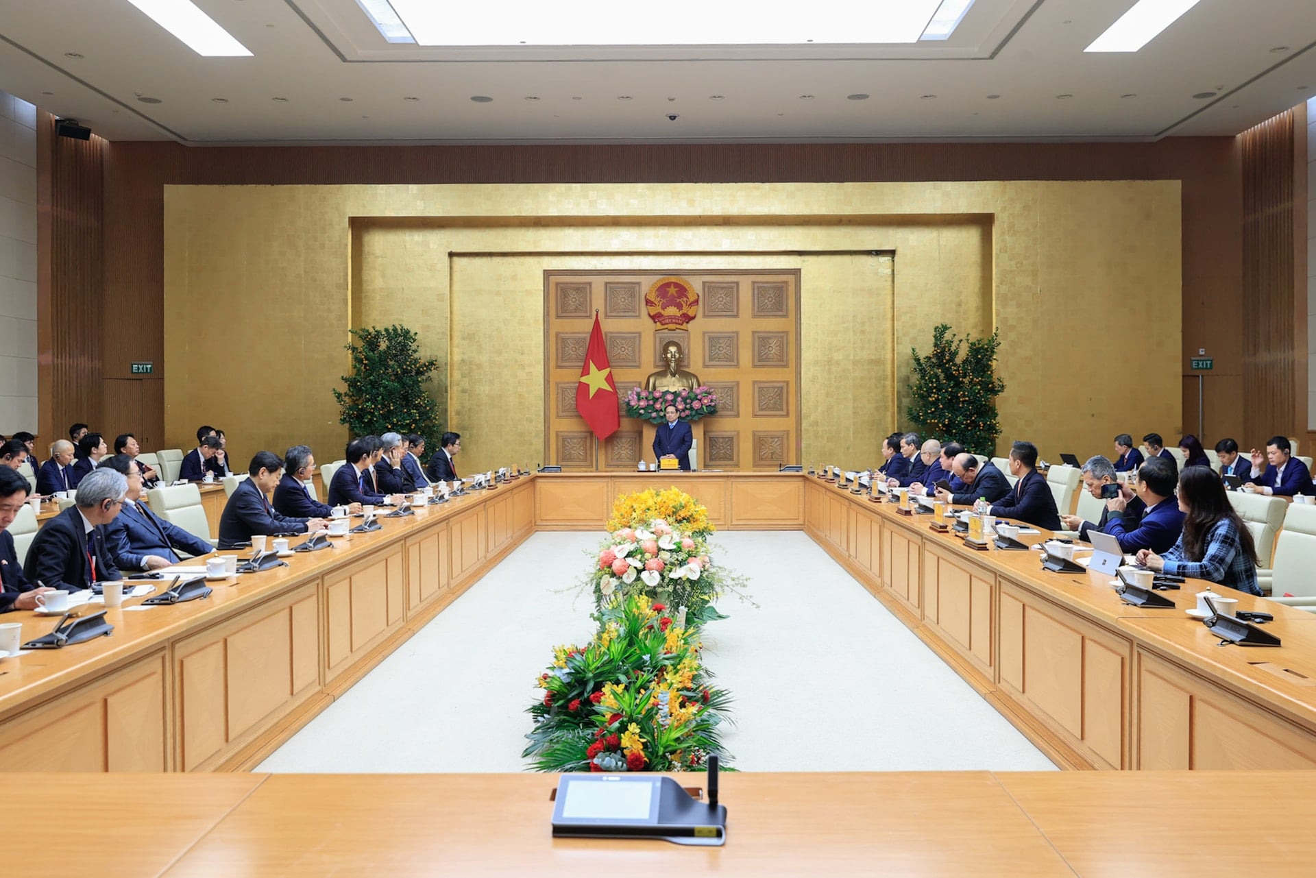 Thủ tướng cảm ơn các doanh nghiệp Nhật Bản đã đến Việt Nam để tìm hiểu, đẩy mạnh hợp tác, mở rộng đầu tư và tin tưởng, sau chuyến thăm làm việc này, các doanh nghiệp sẽ tìm kiếm được nhiều cơ hội hơn; giao các bộ, ngành Việt Nam phối hợp với Đại sứ quán Nhật Bản và JETRO tiếp tục phát huy thành quả đạt được từ trước tới nay, đưa quan hệ hợp tác hai nước bước sang kỷ nguyên mới của sự phát triển; đưa hai nền kinh tế ngày càng gắn kết, bổ sung cho nhau, dựa trên quan hệ chính trị, giao lưu nhân dân hết sức tốt đẹp, góp phần thúc đẩy quan hệ Đối tác chiến lược toàn diện Việt Nam – Nhật Bản.