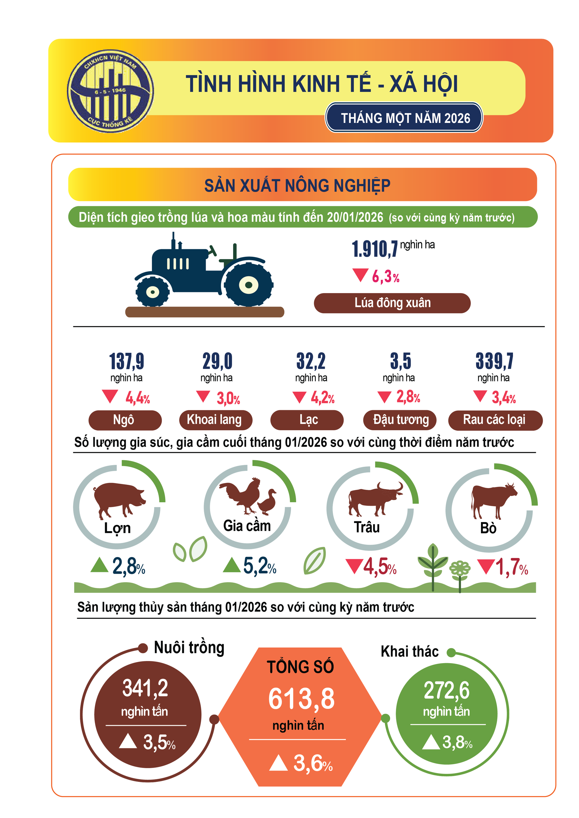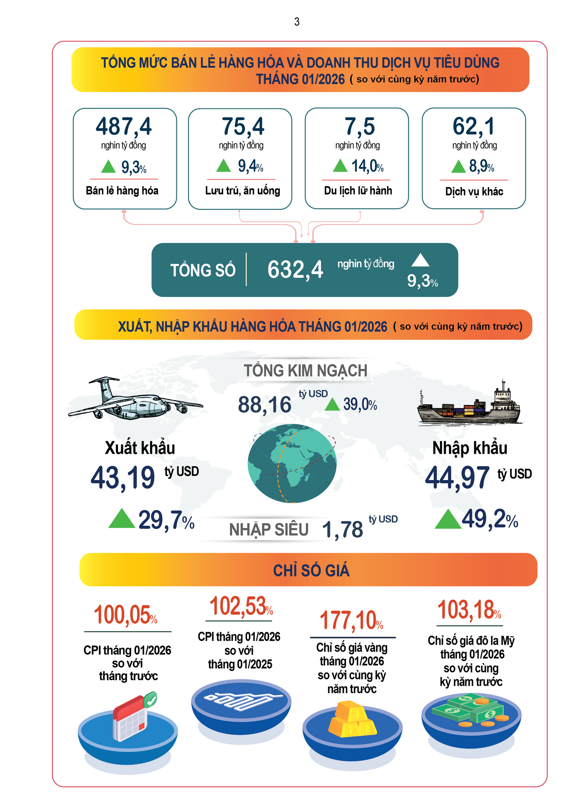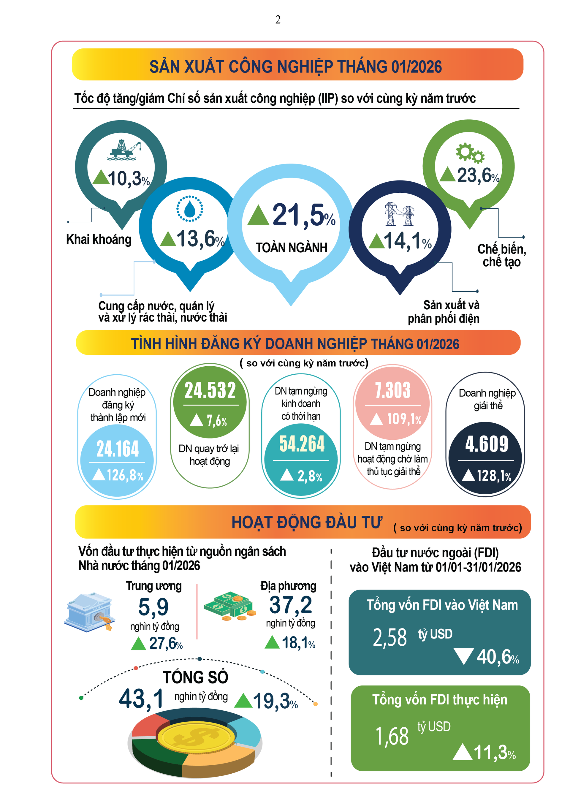 (Banker.vn) Số liệu về tình hình kinh tế - xã hội tháng 1/2026 của Cục Thống kê cho thấy nhiều tín hiệu tích cực như: tổng vốn đầu tư nước ngoài (FDI) vào Việt Nam đạt 2,58 tỷ USD; tổng kim ngạch xuất, nhập khẩu hàng hóa đạt 88,16 tỷ USD, tăng 39% so với năm trước; tổng lượng khách quốc tế đến Việt Nam đạt 2.453,7 nghìn lượt, tăng 18,5%…