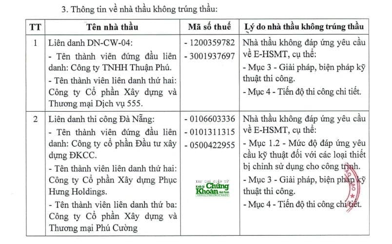 Trong quá trình đấu thầu, ngoài G36 còn có hai liên danh tham gia. Liên danh DN-CW-04 do Công ty TNHH Thuận Phú đứng đầu bị loại do không đáp ứng yêu cầu về giải pháp kỹ thuật và tiến độ thi công chi tiết. Một liên danh khác do Công ty CP Đầu tư xây dựng DKCC đứng đầu, cùng các đối tác Phục Hưng Holdings và Phú Cường, cũng không vượt qua vòng đánh giá do không đáp ứng tiêu chuẩn kỹ thuật đối với một số thiết bị chính, đồng thời phương án thi công và tiến độ chưa đạt yêu cầu hồ sơ mời thầu.