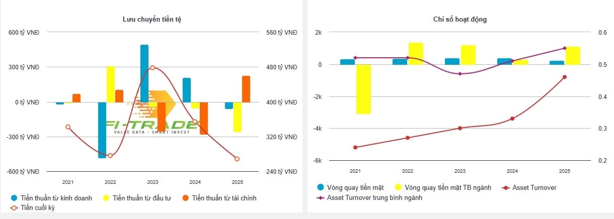 Điểm đáng chú ý nằm ở dòng tiền. Trong năm 2025, dòng tiền kinh doanh của doanh nghiệp âm khoảng 59 tỷ đồng, đảo chiều so với mức dương hơn 243 tỷ đồng của năm trước. Dù doanh nghiệp gia tăng vay nợ cả ngắn hạn và dài hạn, dòng tiền tổng thể vẫn âm khoảng 85,8 tỷ đồng. Điều này phản ánh áp lực vốn lưu động trong hoạt động xây lắp, khi doanh nghiệp phải ứng vốn trước cho các dự án, trong khi dòng tiền thu về phụ thuộc vào tiến độ nghiệm thu và thanh toán.