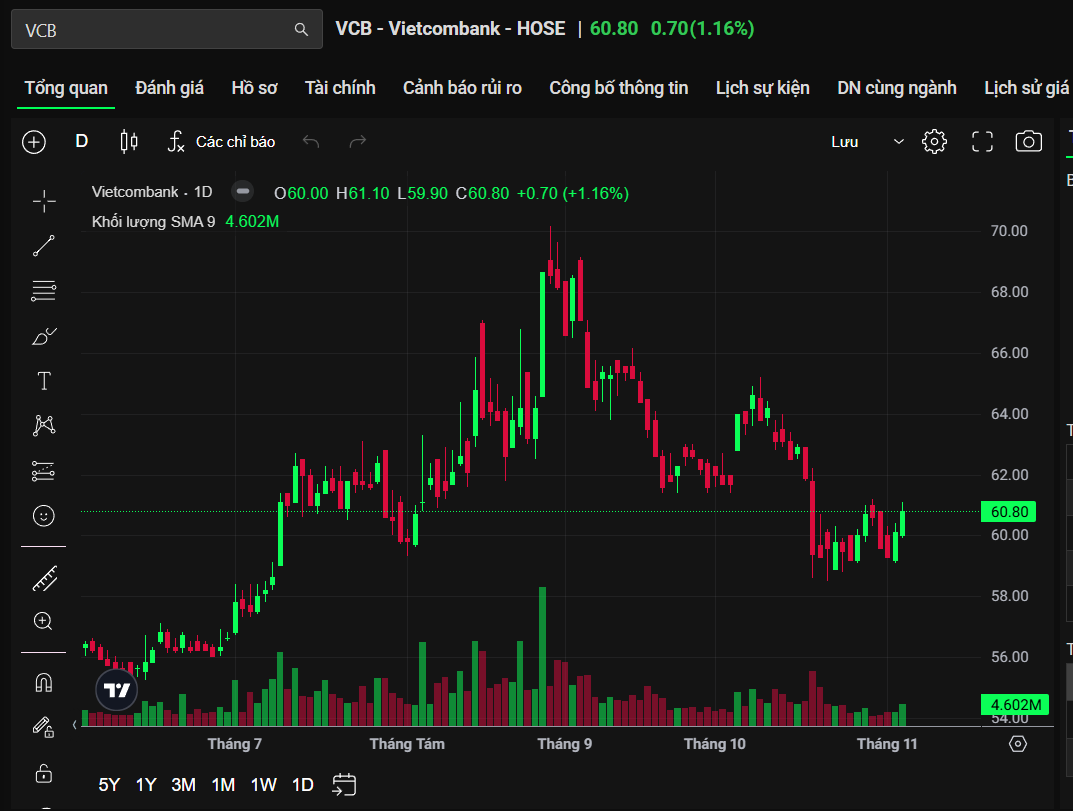 Trên đồ thị, VCB đang trong xu hướng điều chỉnh khi giá từ 64.600 giảm về 60.100 đồng. Cổ phiếu vẫn nằm dưới cả SMA5 và SMA20, RSI ở mức 43 cho thấy xu hướng giảm ngắn hạn nhưng đang tiệm cận vùng quá bán. Vùng hỗ trợ 59.000–59.300 đồng được xem là nền giá quan trọng. TCBS khuyến nghị nhà đầu tư có thể mua khi giá xuất hiện tín hiệu đảo chiều tại vùng này kèm khối lượng tăng, đặt dừng lỗ dưới 59.000 đồng và chốt lời khi giá tiệm cận 62.000–62.500 đồng.