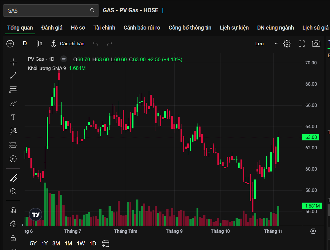 Về kỹ thuật, GAS đang trong giai đoạn tích lũy quanh vùng 60.000 đồng, dao động hẹp giữa 59.000 và 62.000 đồng. SMA5 nằm trên SMA20 và MACD dương nhẹ cho tín hiệu hồi phục, trong khi RSI ở mức 51 thể hiện trạng thái trung tính. TCBS cho rằng đột phá qua ngưỡng 62.000 đồng sẽ xác nhận xu hướng tăng mới, đồng thời vùng 59.000 đồng tiếp tục là hỗ trợ quan trọng cho chiến lược nắm giữ. Nhà đầu tư có thể mua thăm dò khi giá điều chỉnh về vùng 59.000–59.500 đồng, cắt lỗ nếu thủng 58.500 đồng, và chốt lời khi giá vượt 62.000 đồng với khối lượng cao.