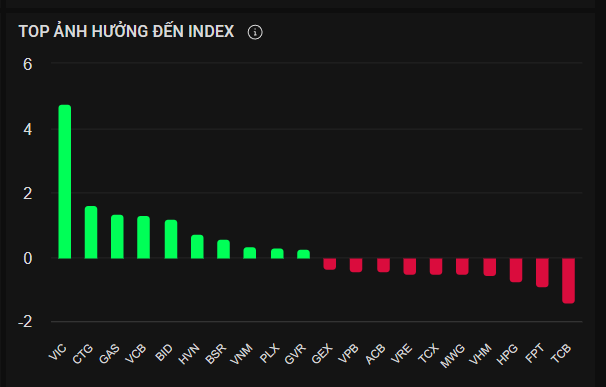 Theo thống kê từ hệ thống dữ liệu Fitrade.kinhtechungkhoan.vn, Top 5 cổ phiếu đóng góp lớn nhất vào đà tăng của VN-Index, gồm có: VIC (4,76 điểm), CTG (1,63), GAS (1,36 điểm), VCB (1,31 điểm), BID (1,18 điểm).