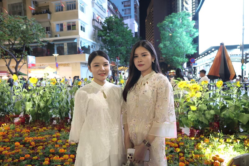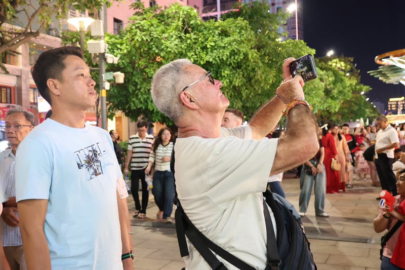 Những vị khách nước ngoài cũng hào hứng hòa mình vào dòng người du xuân, ghi lại hình ảnh rực rỡ của TP. Hồ Chí Minh trong đêm giao thừa. Ảnh: Minh Anh