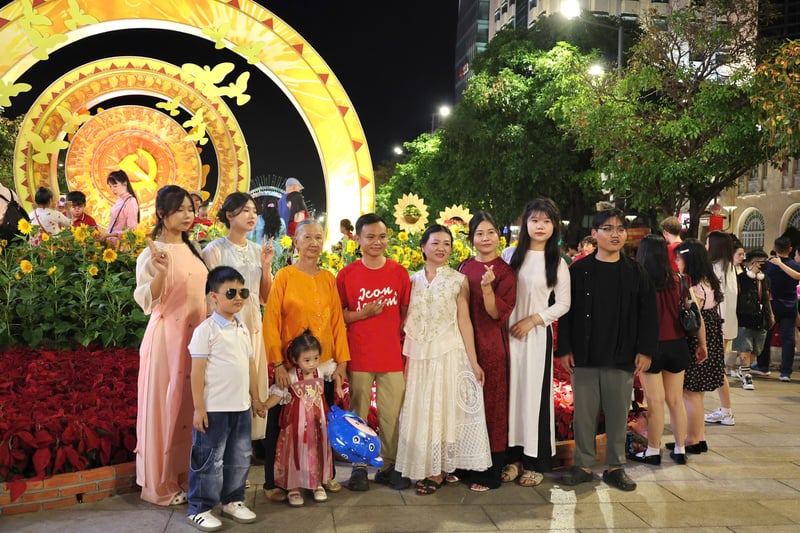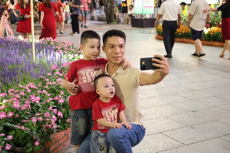 Nhiều gia đình tranh thủ ghi lại những hình ảnh kỷ niệm bên các thảm hoa rực rỡ tại khu vực phố đi bộ Nguyễn Huệ trong tối 29 Tết. Ảnh: Minh Anh