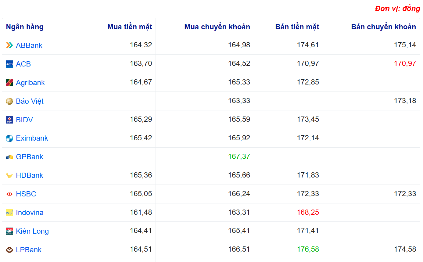 Tỷ giá yên Nhật tại Sở giao dịch Ngân hàng Nhà nước duy trì trong khoảng 155 – 171 đồng/JPY, trong khi tại các ngân hàng thương mại, Vietcombank mua vào 162,25 đồng/JPY và bán ra 172,56 đồng/JPY, VietinBank giao dịch ở mức 163,02 – 174,52 đồng/JPY, còn BIDV niêm yết 165,29 – 173,45 đồng/JPY.