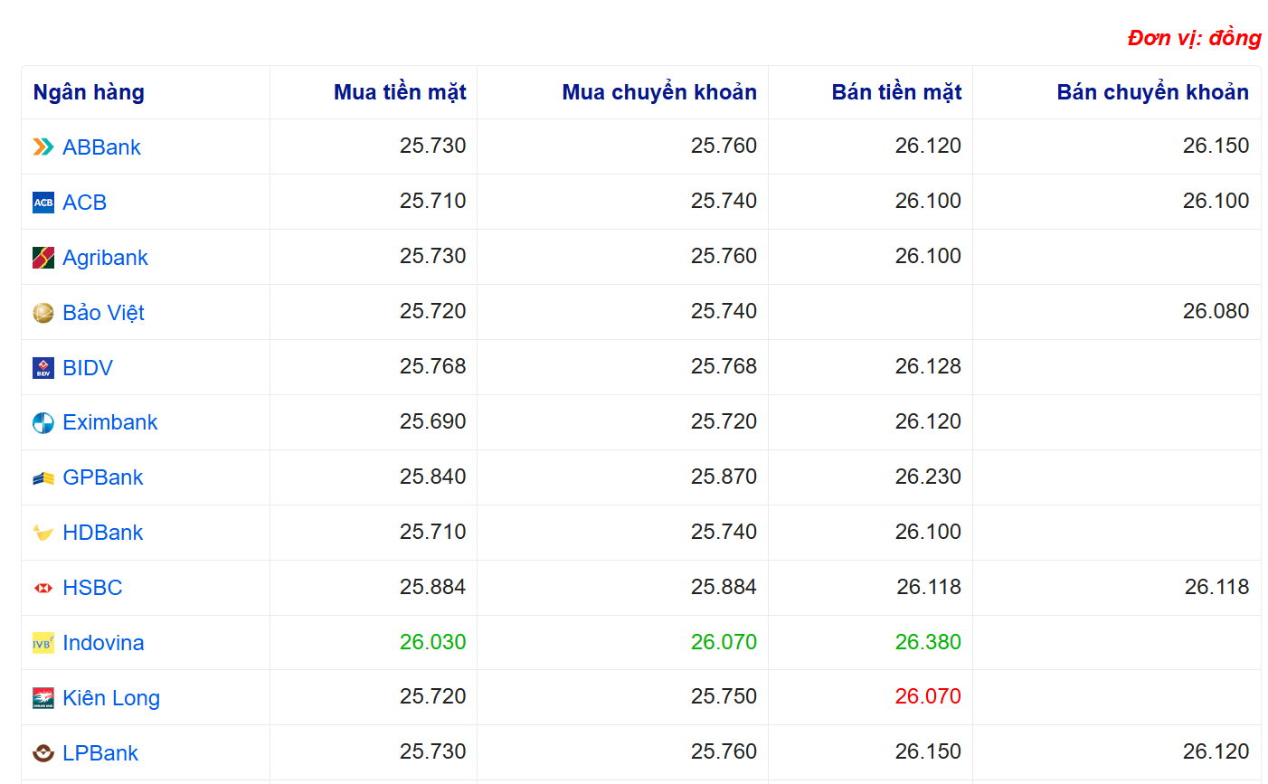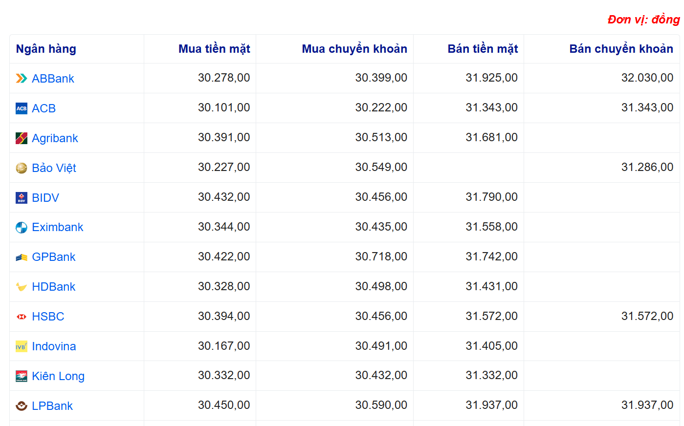 Tỷ giá USD tại một số ngân hàng: