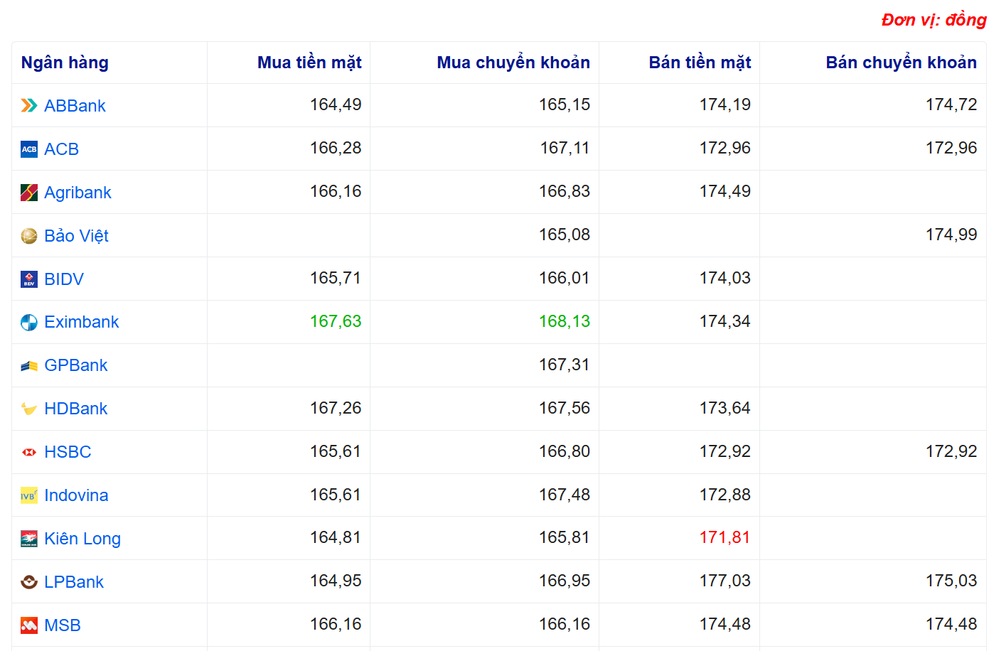 Tỷ giá yên Nhật tại một số ngân hàng: