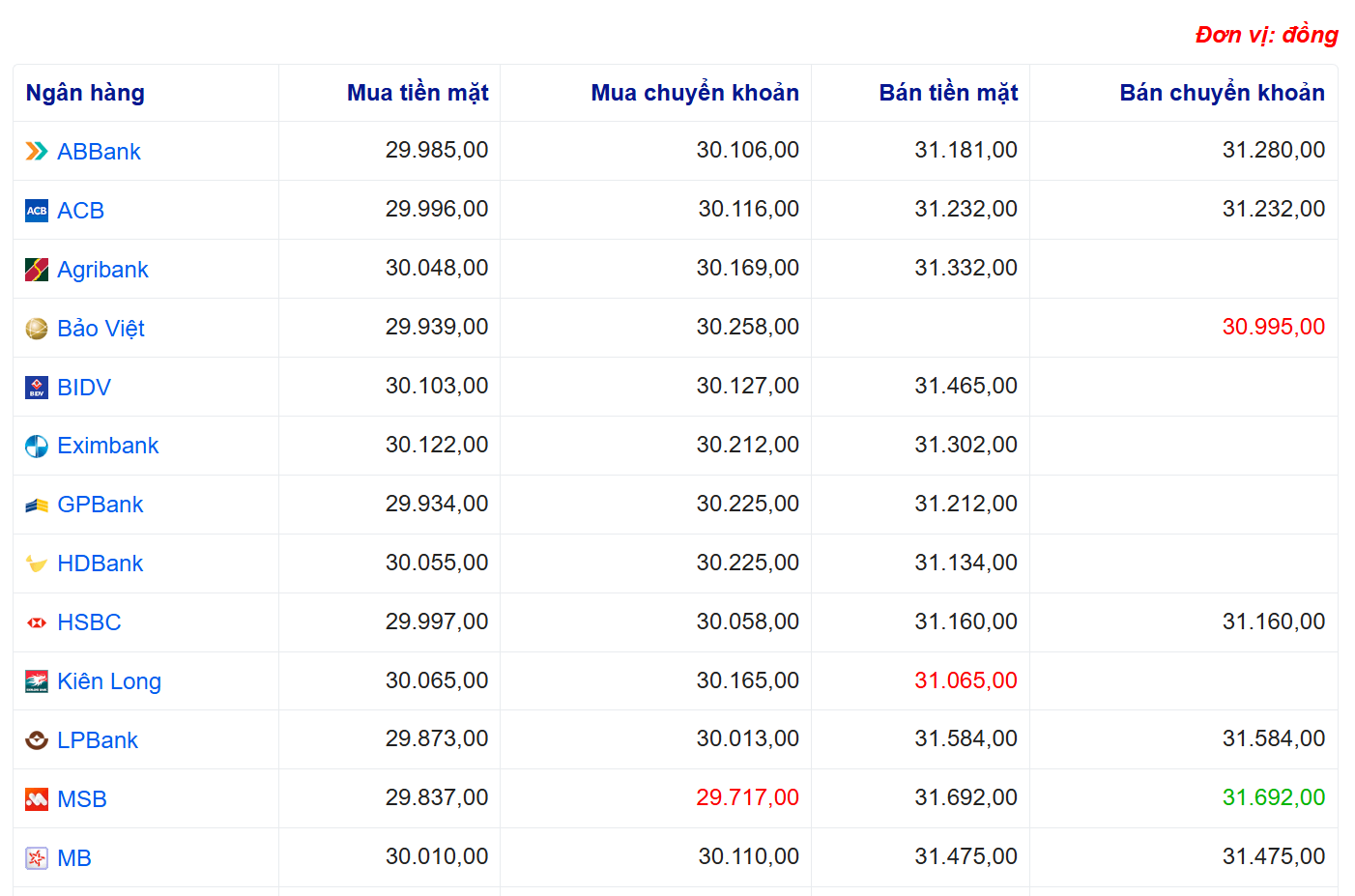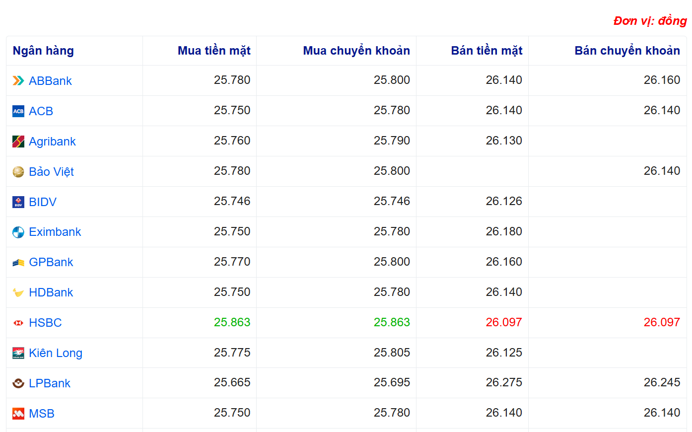 Tỷ giá USD tại một số ngân hàng: