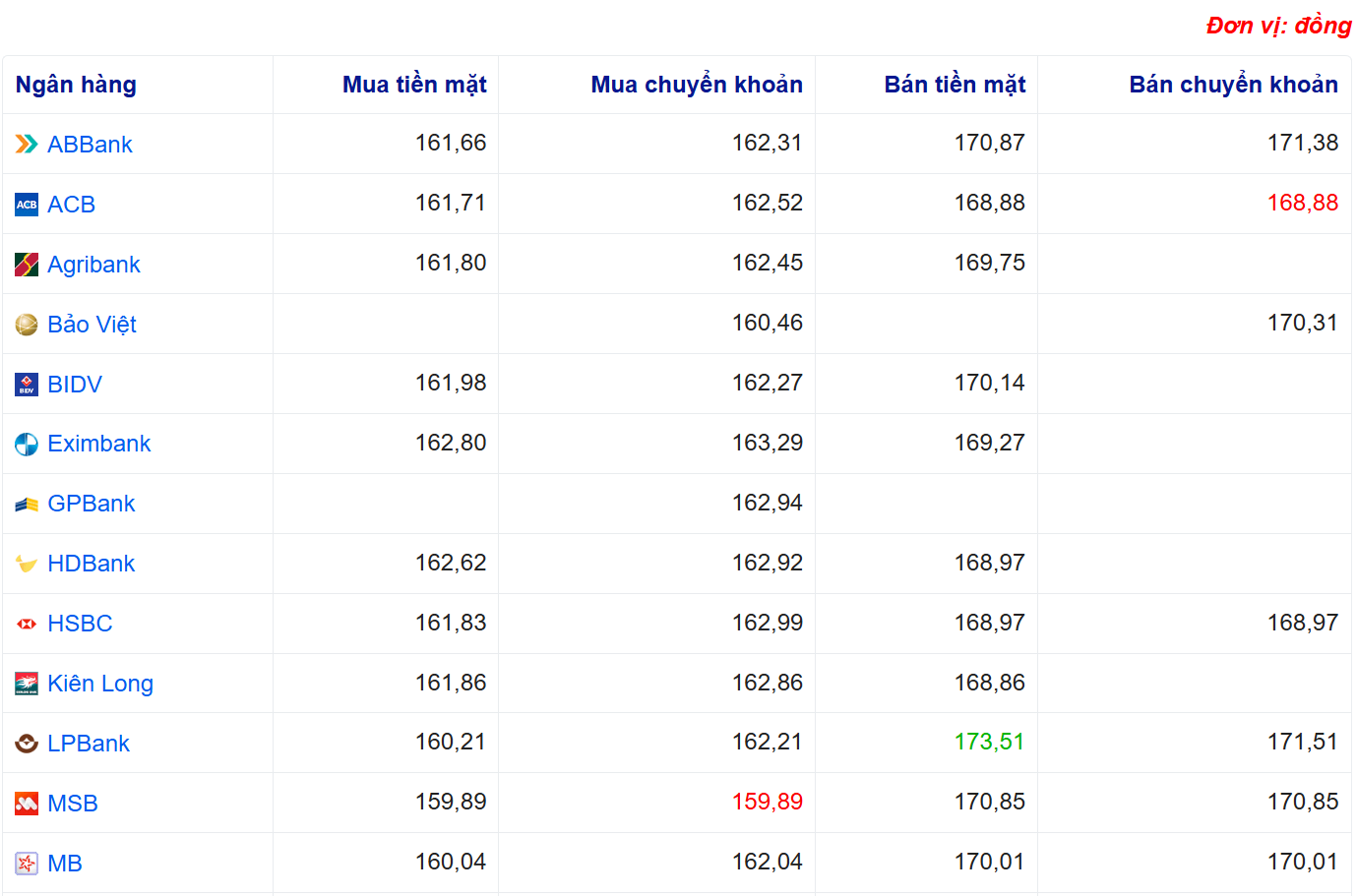 Tỷ giá yên Nhật tại Sở giao dịch Ngân hàng Nhà nước duy trì trong khoảng 152 – 168 đồng/JPY, trong khi tại các ngân hàng thương mại, Vietcombank mua vào 159,83 đồng/JPY và bán ra 169,98 đồng/JPY, BIDV giao dịch ở mức 161,98 – 170,14 đồng/JPY.