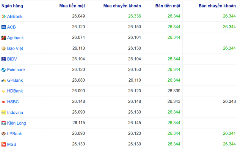 Ngân hàng ABBank, ACB đang bán chuyển khoản Đô la Mỹ với giá cao nhất là: 1 USD = 26.344 VND